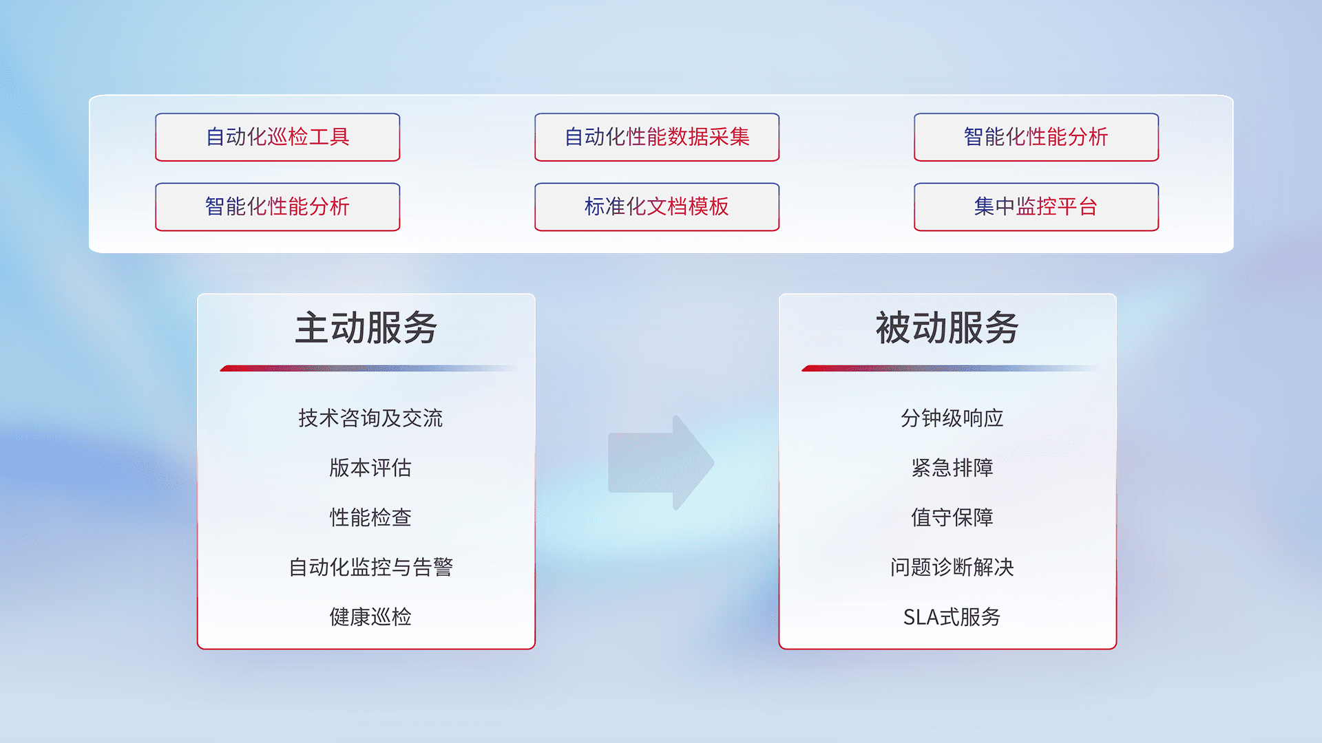 智能化工具和标准化文档,,保障服务质量,,,,提供主动服务(包含技术咨询、、、版本评估、、性能检查、、、、自动化监控与告警、、、健康巡检)和被动服务包含(分钟级响应、、紧急排障、、、值守保障、、、问题诊断解决、、、SLA服务)。。