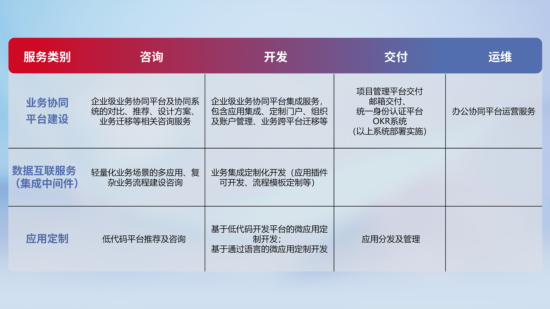 针对钉钉、、、、企微、、IDaas等平台级产品提供产品的规划、、、、方案、、、交付、、、、定制化开发等服务,,,实现如统一协同办公、、智能客户服务、、混合会议管理、、智能数据查询、、、、等业务场景,,,,实现数字化转型。。